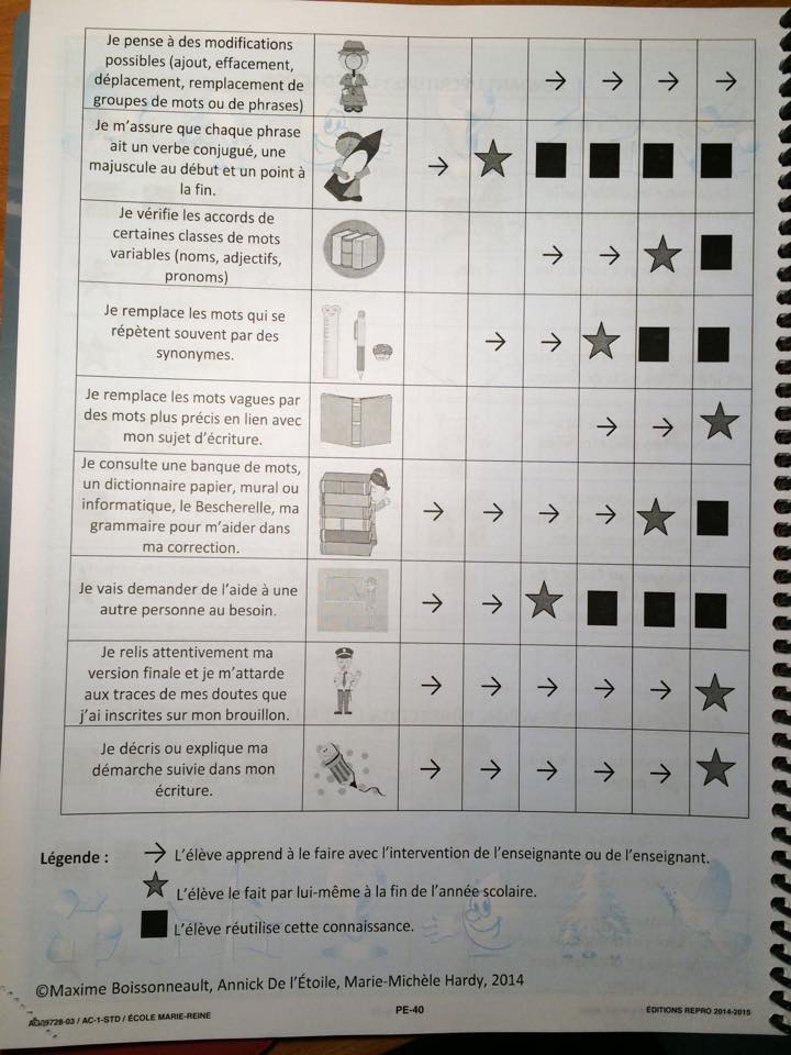 Cette grille des stratégies est le premier pas vers l’uniformisation des pratiques de l’enseignement en écriture. On retrouve les mêmes stratégies énoncées dans la grille et les images sur les outils de révision et de correction et sur les référentiels de classe.